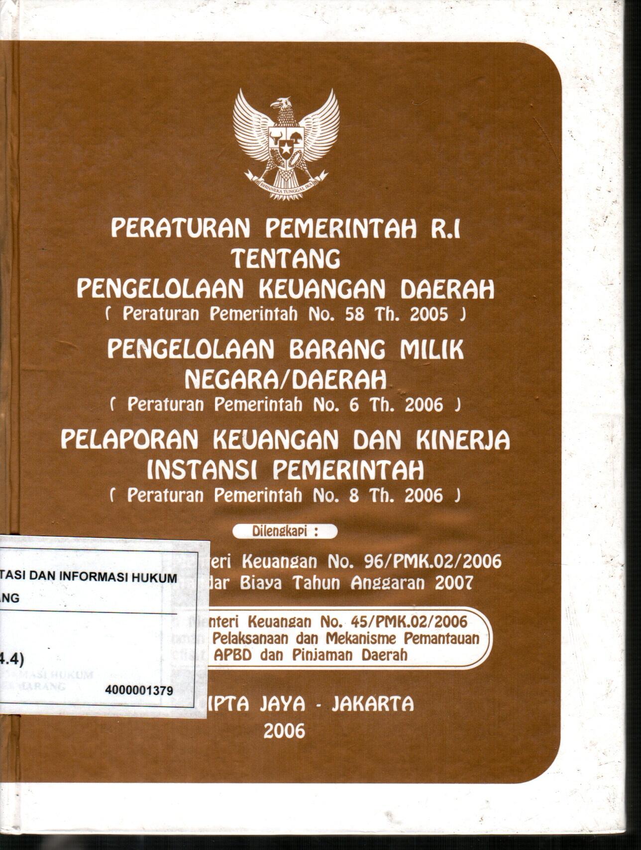 Peraturan Pemerintah R.I Tentang Pengelolaan Keuangan Daerah (Peraturan Pemerintah No. 58 Th. 2005) Pengelolaan Barang Milik Negara/Daerah ( Peraturan Pemerintah No. 6 Th. 2006) Pelaporan Keuangan Dan Kinerja Instansi Pemerintah (Peraturan Pemerintah No. 8 Th. 2006) Dilengkapi; Peraturan Mentri Keuangan No. 96/PMK.02/2006 Tentang Standar Biaya Tahun Anggaran 2007