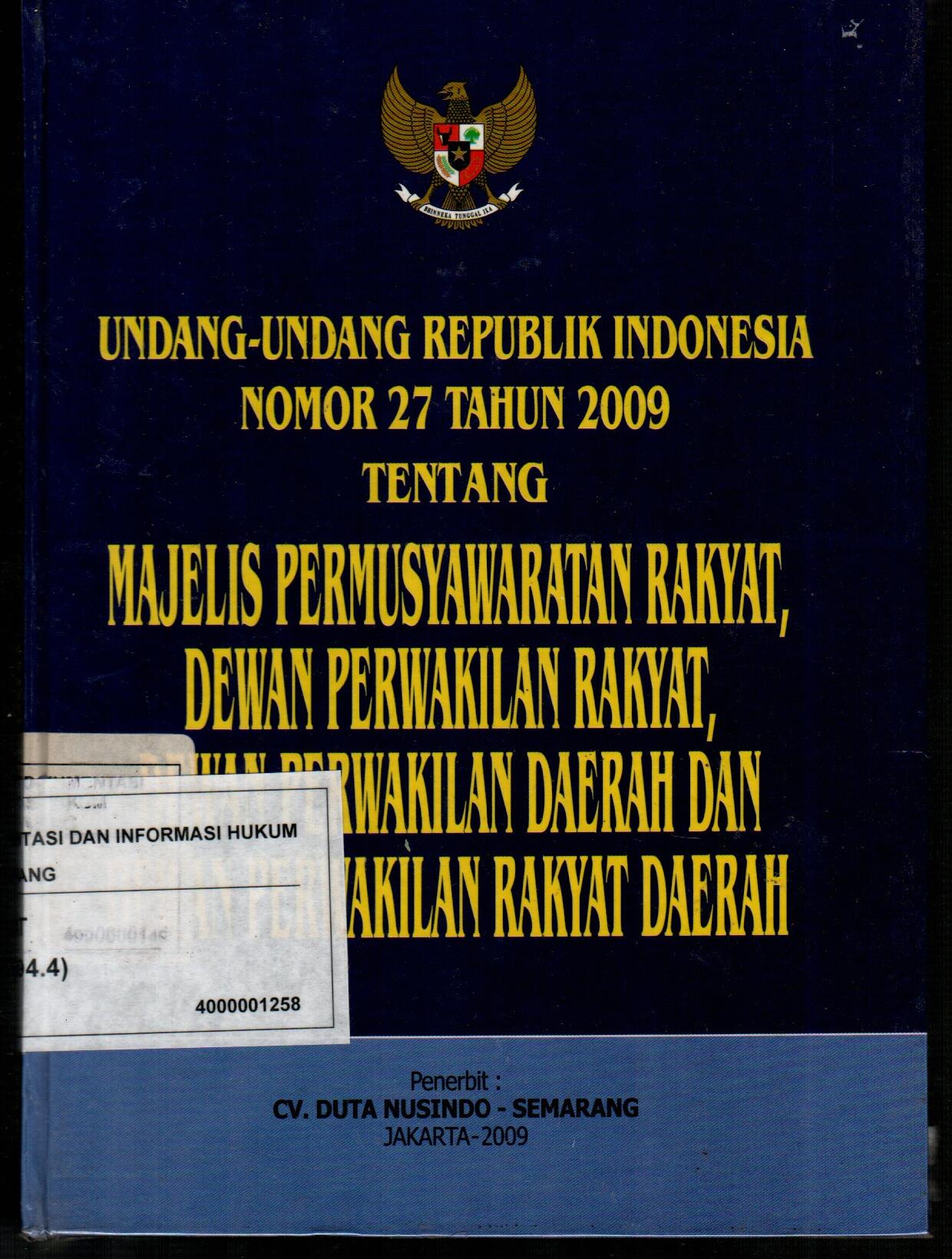 UNDANG-UNDANG REPUBLIK INDONESIA NOMOR 27 THUN 2009 TENTANG MAJELIS PERMUSYAWARATAN RAKYAT, DEWAN PERWAKILAN RAKYAT, DEWAN PERWAKILAN DAERAH, DAN PERWAKILAN RAKYAT DAERAH