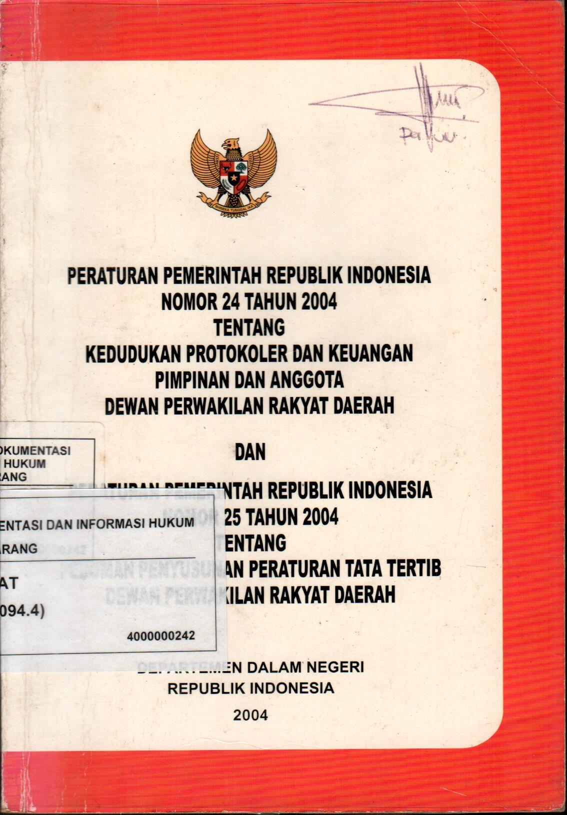 Peraturan Pemerintah Republik Indonesia Nomor 24 Tahun 2004 Tentang Kedudukan Protokoler Dan Keuangan Pimpinan Dan Anggota Dewan Perwakilan Rakyat Daerah Dan Peraturan Pemerintah Republik Indonesia Nomor 25 Tahun 2004 Tentang Pedoman Penyusunan Peraturan Tata Tertib Dewan Perwakilan Rakyat Daerah