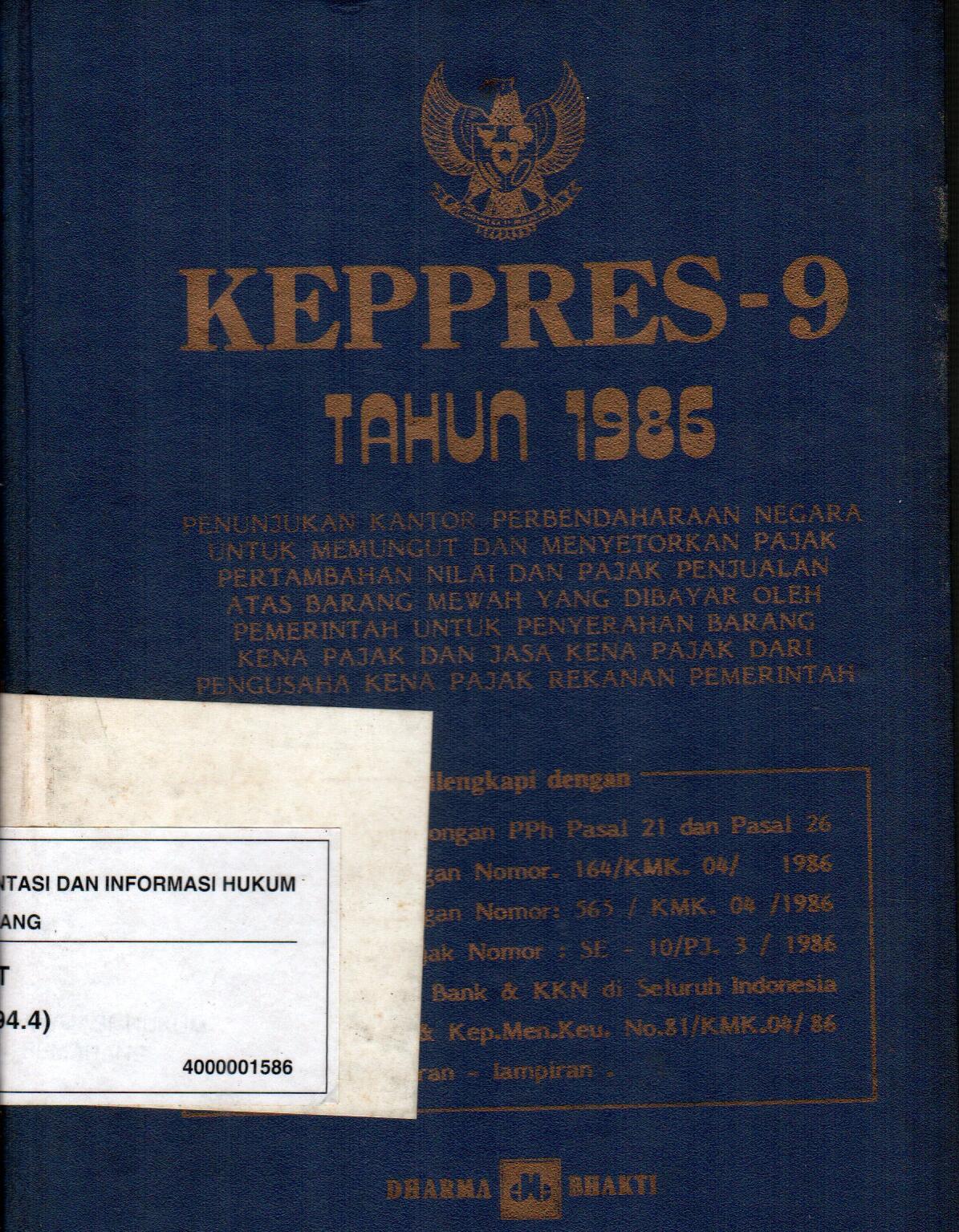 Keppres-9 Tahun 1986 Penunjukan Kantor Pembendaharan Negara Untuk Memungut Dan MenyetorkN Pajak Pertambahan Nilai Dan Pajak Penjualan Atas Barang Mewah Yang Dibayar Oleh Pemerintah Untuk Penyerahan Barang Kena Pajak Dan Jasa Kena Pajak Dari Pengusaha Kena Pajak Rekanan Pemerintah