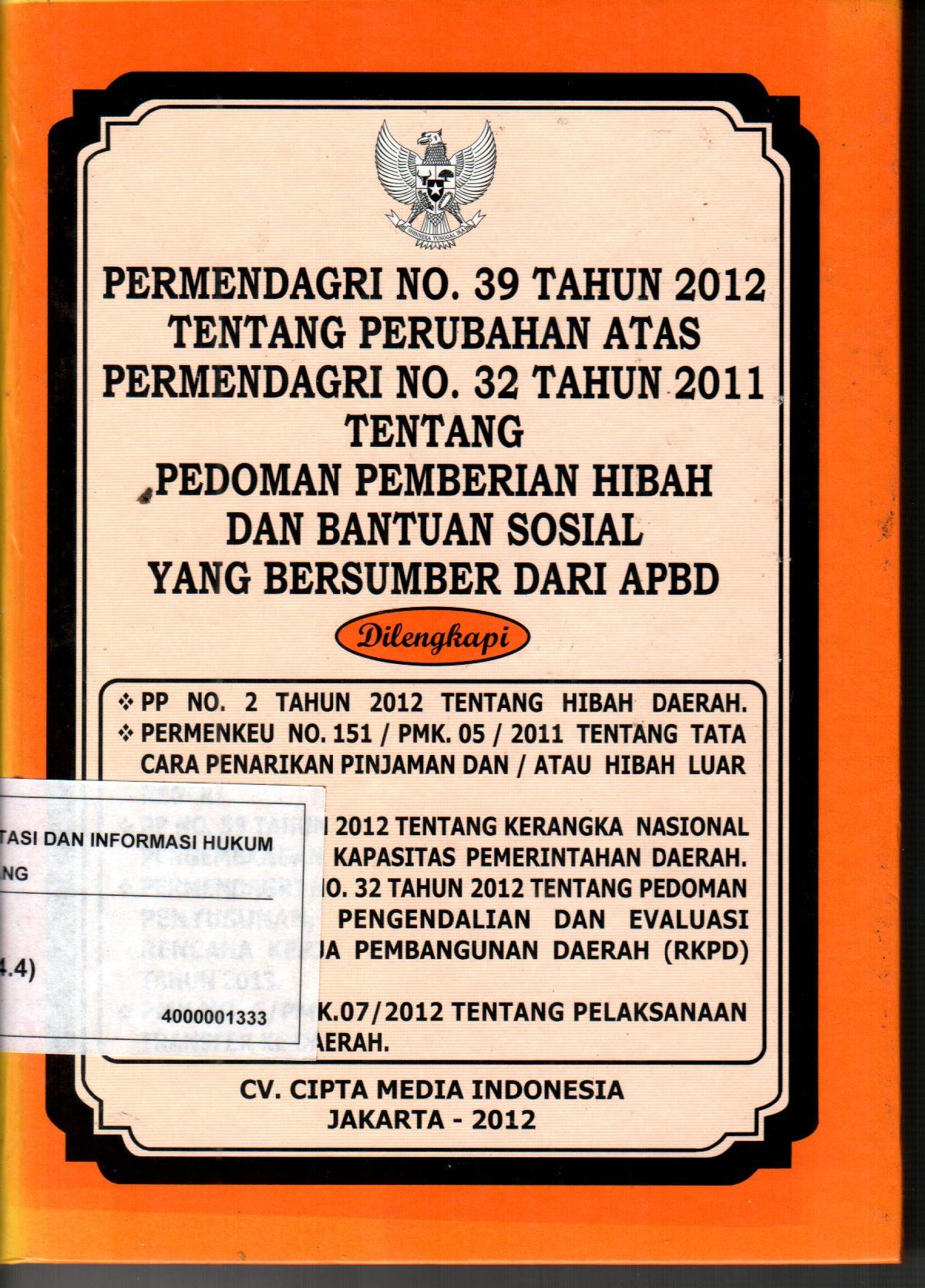 Permendagri No. 39 Tahun 2012 Tentang Perubahan Atas Permendagri No. 32 Tahun 2011 Tentang Pedoman Pemberian Hibah Dan Bantuan Sosial Yang Bersumber Dari APBD